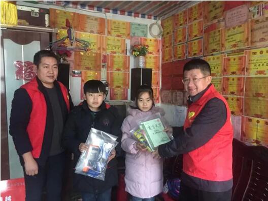 志愿者為侯瑋杰、侯瑋靜兄妹送上新衣服和愛心禮包