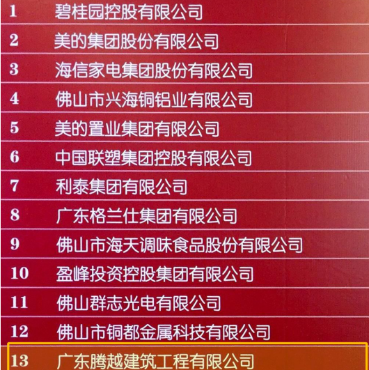 據(jù)悉,本次入圍佛山企業(yè)100強中,來自順德的企業(yè)占據(jù)總榜單69%,總營業(yè)收入高達9294億元。作為順德區(qū)土生土長的企業(yè),廣東騰越此次成功入選“2019年佛山市100強企業(yè)”,可謂實至名歸!